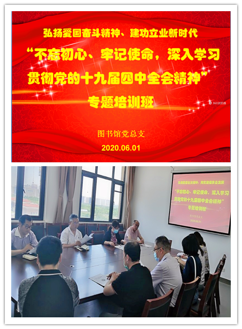 为深入学习贯彻习近平新时代中国特色社会主义思想和党的十九届四中全会精神的理论自觉和行动自觉,进一步厚植家国情怀,弘扬爱国主义精神,加强新时代爱国主义教育,激发爱党爱国爱社会主义的巨大热情,将爱国主义精神转化为每一名党员干部的坚定信念和自觉行动,为实现伟大梦想提供强劲动力,图书馆党总支特举办本次“弘扬爱国奋斗精神、建功立业新时代”——《不忘初心、牢记使命,深入学习贯彻党的十九届四中全会精神》专题培训班。