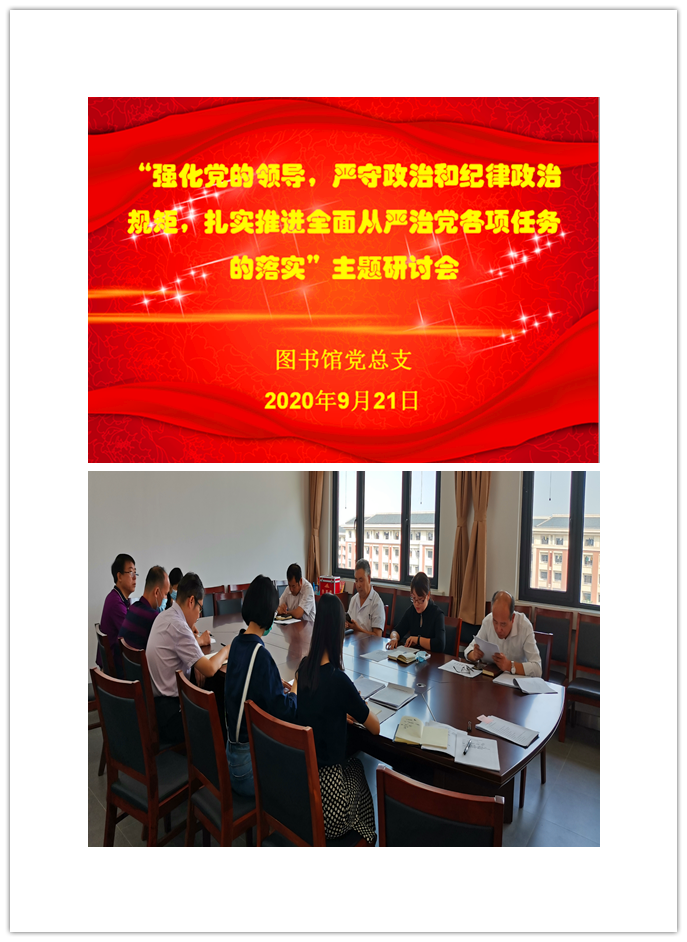 为深入学习校长张伯礼院士的英雄事迹,落实我校《关于推动我校2020年政治生态重点任务落实的通知》和《2020年天津中医药大学党委全面从严治党工作要点》的工作要求,切实将全面从严治党各项任务抓实、抓细、抓出成效,9月21日,图书馆党总支开展“强化党的政治领导,严守政治纪律和政治规矩,扎实推进全面从严治党各项任务落实”学习研讨会,馆领导班子成员、总支委员、党支部书记、各部门主任参会。