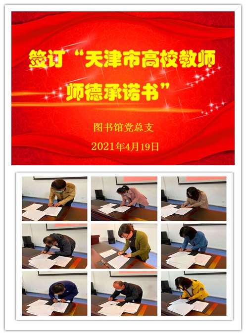 随后,图书馆党总支召开了师德师风建设警示教育大会。刘怡书记带领大家学习了《关于进一步加强高校师德师风建设、严格师德师风建设、严禁教师违反师德师风行为的通知》(“十项严禁”)、《关于建立天津市教师师德承诺书和师德档案的通知》和《天津中医药大学教师师德失范行为处理的实施细则》等文件。她要求大家严格执行并遵守师德师风建设的相关规定,落实立德树人根本任务,深入学习习近平总书记关于教育的重要论述。要通过学习党史回顾党的光辉历程,坚定政治立场,严守师德底线,在学党史、悟思想、办实事、开新局中“强师德、正师风、铸师魂”,以优异成绩迎接建党100周年。全体教职工现场逐一签订了承诺书。
