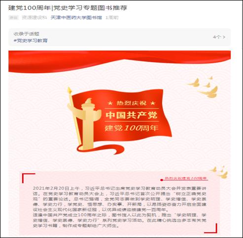 同时,资源建设科在“天津中医药大学图书馆”微信公众号推送“建党100周年-党史学习专题图书”文章。推荐党史学习专题图书20种,包括《中国共产党简史》《党史党建研究文集》《苦难辉煌》《时代大潮和中国共产党》《习近平的七年知青岁月》《习近平用典 第一辑》、《习近平用典 第二辑》等,并将每种图书的作者、出版社、出版时间、图书馆索书号、馆藏地点、内容简介一一罗列,方便读者了解图书基本信息,引导读者更便捷高效地借阅图书。