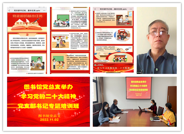 同时,图书馆党总支启动了党支部书记培训班,本次培训内容为党的二十大精神、《党支部的基本任务》《中国共产党支部工作条例(试行)》和《中国共产党普通高等学校基层组织工作条例》。两位党支部书记表示,今后将继续深化对党支部工作的认识,对照《中国共产党普通高等学校基层组织工作条例》和《新时代天津中医药大学基层党支部标准化规范化建设实施方案的通知》的具体要求,继续推动党支部标准化规范化建设。