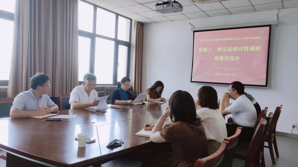 为进一步深化学习贯彻习近平新时代中国特色社会主义思想,推动主题教育走深走实,不断提升二级党组织理论学习中心组学习质量和水平,校党委组织开展2023年党委理论学习中心组学习交叉巡听工作。6月26日上午,图书馆党总支在图书馆5楼会议室召开了学习贯彻习近平新时代中国特色社会主义思想主题教育专题三、四交流研讨暨调研成果交流会。交叉巡听工作组第三小组副组长王芳婷、联络员李帅到会,针灸推拿学院院长郭永明、中药制药工程学院党委副书记金瑞参加交流,图书馆党总支理论学习中心组成员党总支书记刘怡、副馆长郑超和杨木锐参会,党外处级领导干部馆长徐宗佩参加。