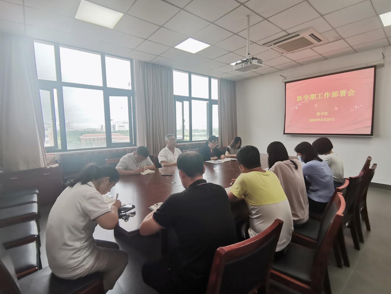 图书馆迎新季,为做好新学期各项工作,切实把主题教育激发出来的学习、工作热情转化为攻坚克难、干事创业的强大动力,推动图书馆事业高质量发展,8月21日上午,在图书馆五楼会议室,图书馆召开新学期工作部署会暨干部专题培训会。图书馆党总支书记刘怡、馆长徐宗佩、副馆长郑超和杨木锐出席,图书馆党总支委员、党支部书记和部门主任参会。会议由党总支书记刘怡主持。