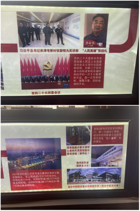 全体党员对展览中出现的“人民英雄”我校名誉校长张伯礼、组分中药国家重点实验室和海河实验室的照片特别感兴趣,倍感荣耀、深受鼓舞。在码头党旗处,大家重温入党誓词,进一步坚定理想信念,砥砺初心使命。