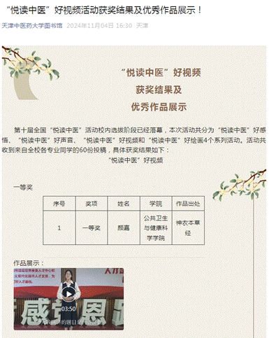 一等奖的作品来自我校公共卫生与健康科学学院的颜嘉同学,作品名称是《药香济世,千年传承》,作品出处是《神农本草经》。她在视频中说道:“在这部典籍中,我们看到了中医药与自然的紧密联系。《神农本草经》强调:“草木虫鱼,各有善恶,宜知其性,用其利,避其害。”这体现了中医药顺应自然、和谐共生的理念,也教导我们在使用草药时,要尊重自然规律,合理利用资源。鹏北海,凤朝阳,又携书剑路茫茫。作为中医药的传承者,我们肩负着弘扬《神农本草经》的重任,让中医药的药香传遍四海。”