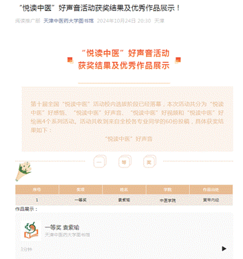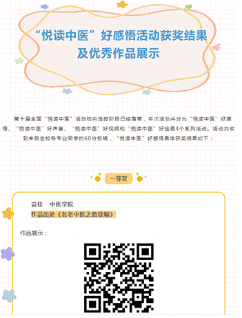 本次系列活动中,我校征集到达作品总量达60件,按照文件要求,可推荐3名中医药阅读候选人。这3名候选人为此次系列活动的一等奖获得者。他们都在个人荐读视频中推荐了对自己影响颇深的中医经典,并表示作为当代大学生要有一颗坚定热爱向学的心,阅读经典,传承经典,不忘初心、牢记使命,要将中医药文化的火炬代代相传,为人类健康事业续写新的篇章。